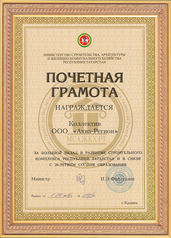 Почетная грамота министерства строительства и архитектуры РТ коллективу Аква-Регион