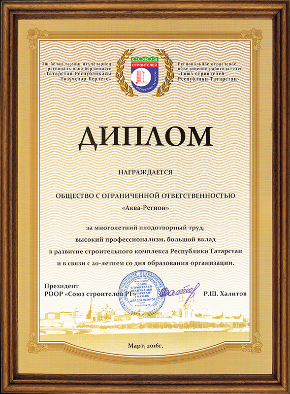 Диплом президента «Союз строителей РТ» за многолетний профессионализм Аква-Регион