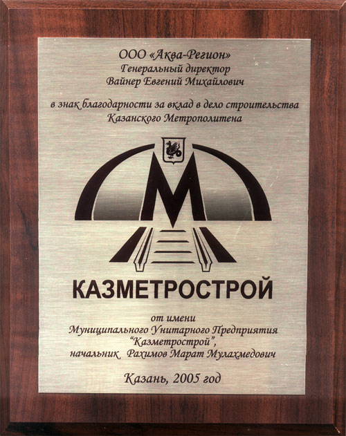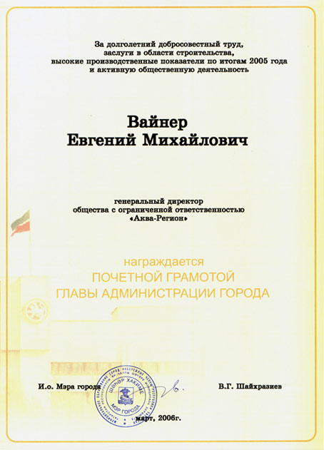 Генеральный директор ООО "Аква-Регион" Вайнер Евгений Михайлович награжден грамотой мэра города Наб. Челны за долголетний добросовестный труд, заслуги в области строительства, высокие показатели в строительстве по итогам 2005 года и активную общественную деятельность.